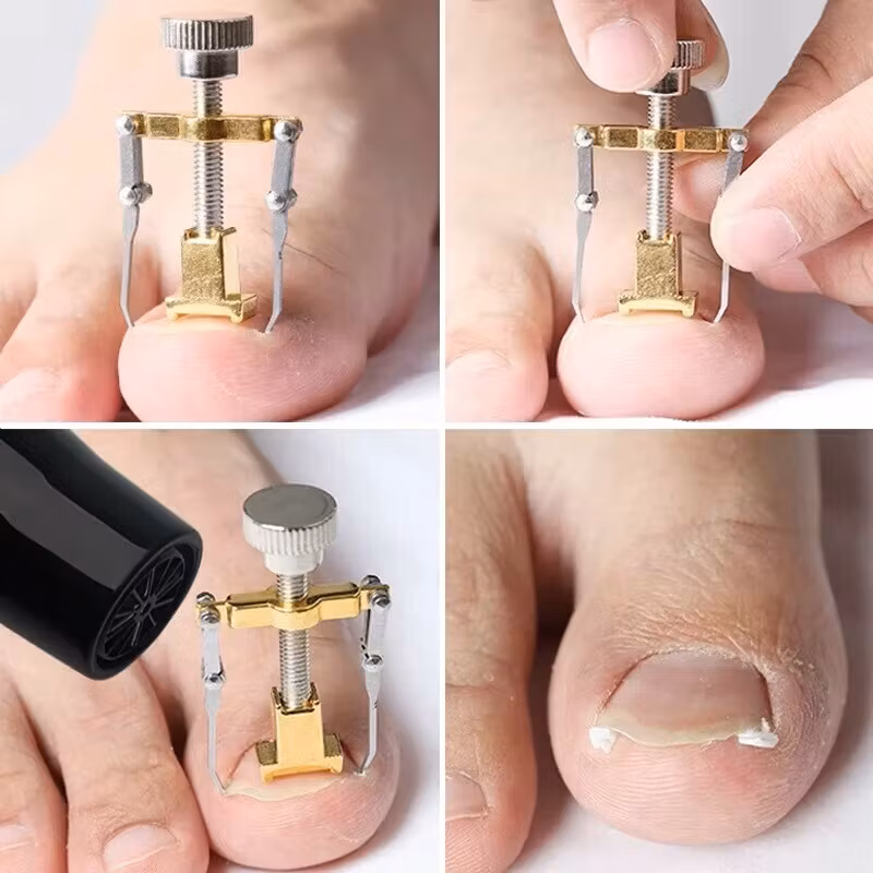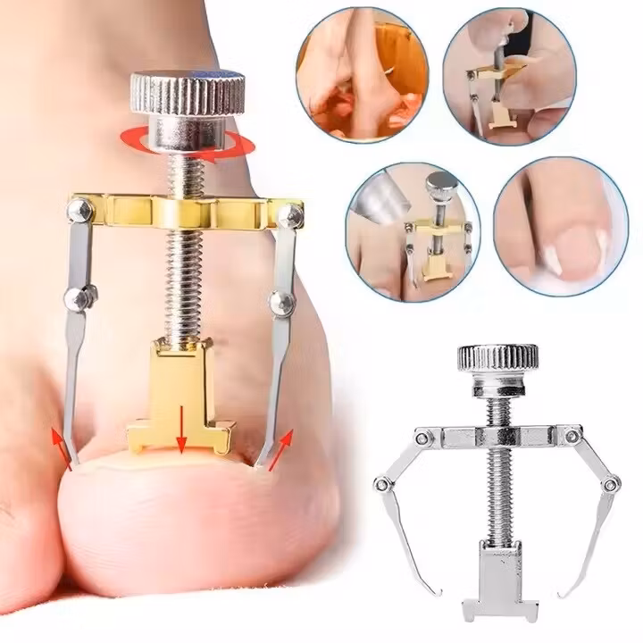 Verktyget lättar på trycket från nageln vid nageltrång. Genom att placera nageltrångsverktyget över nageln och fästa klorna under nagelns sidor kan du försiktigt lyfta nageln och lätta på trycket.